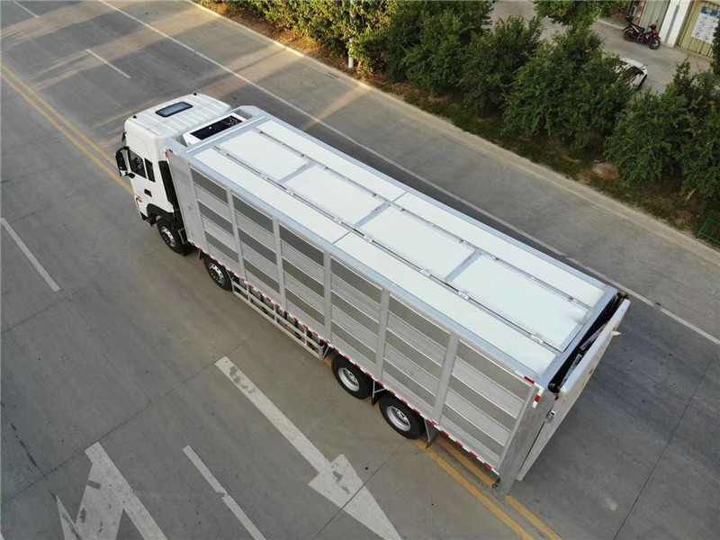上裝為鋁合金廂式結構,廂長6.8米,寬2.5米,高2.6米,開模型材插接式焊接,車身質量輕強度高防 腐蝕性強可耐80度高溫消毒,廂體有效避免高溫傳導,內部通道和頂板可翻轉,便于裝卸清洗,車廂恒溫、燃油加熱、監控,標配三層混合隔倉共18個降溫噴霧和18個喂食飲水咀,可開合側窗、每層4個高轉速防水通風排氣扇、每層備用電瓶2個可供排氣扇使用7小時,風扇排風量 m3/h 500、1200、1400、2200,后部液壓圍板裝卸1.5噸承載力、同步穩定上升速度快、圍板面積5平方,三層每層高850mm四層每層高620mm,裝運面積每層14.25平方,三層可拉80頭125公斤豬,4層可拉850頭8公斤小豬苗。